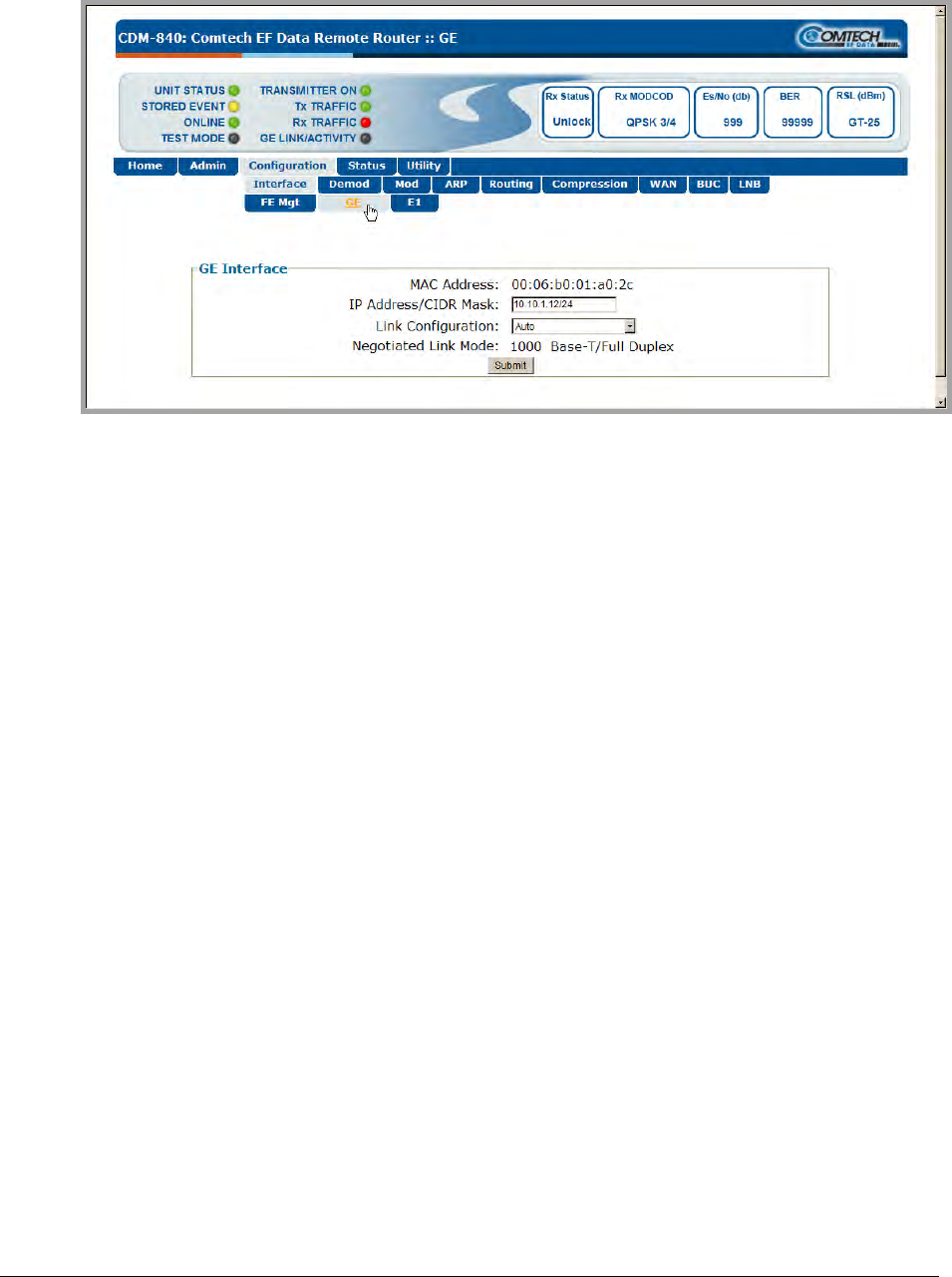 The ‘Configuration | Interface | GE’ page (Figure 5-9) permits the user to configure the GE