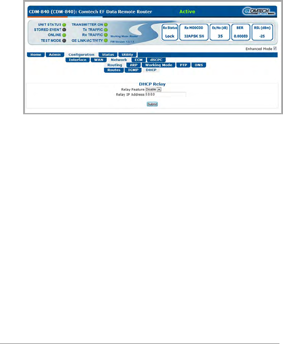 The CDM-840 DHCP Relay feature allows the operator to deploy a single DHCP server at the hub