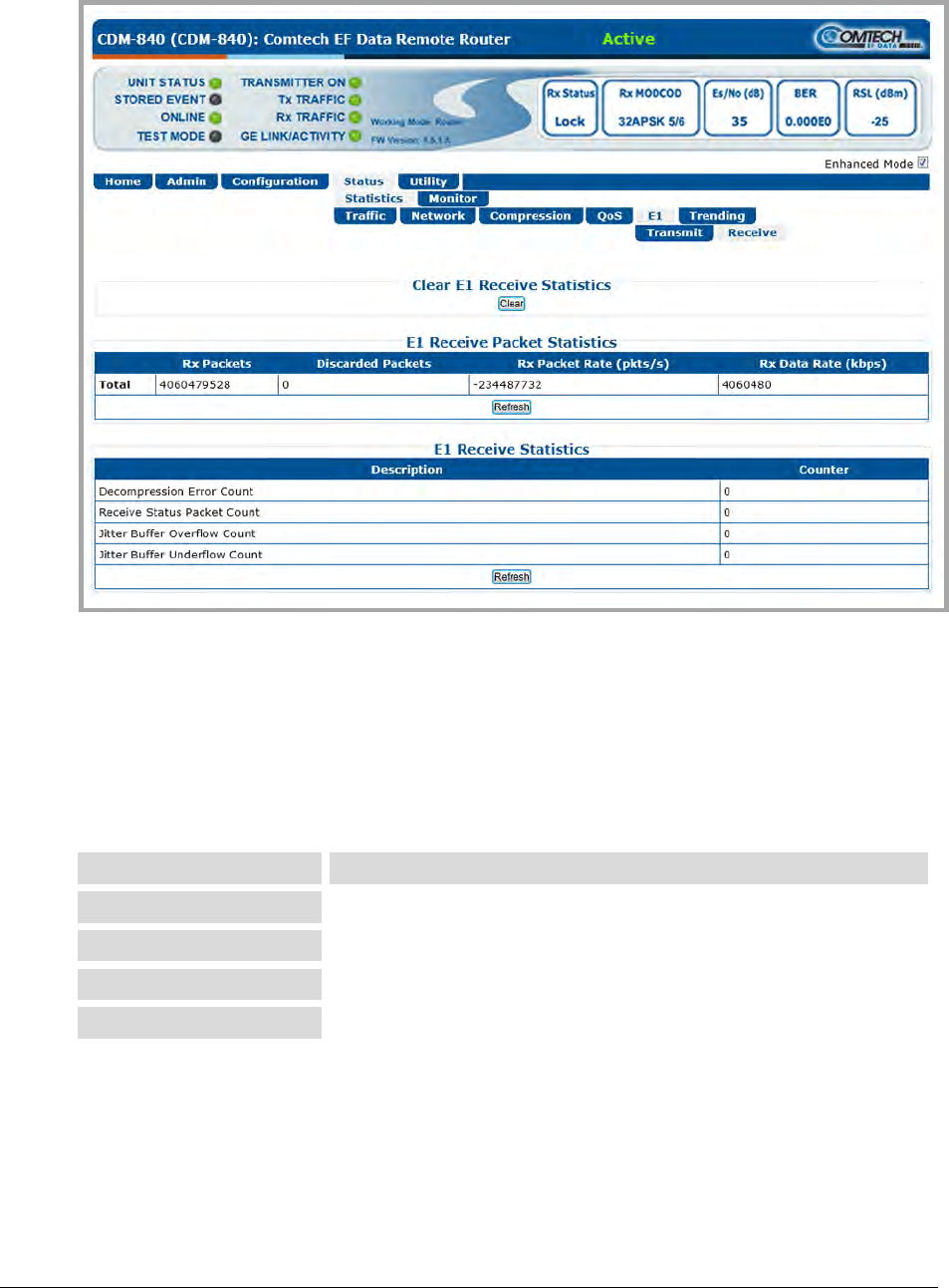 Click [Clear] to clear all E1 Receive Statistics from the buffer.